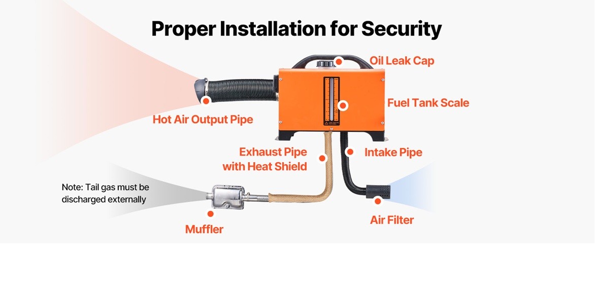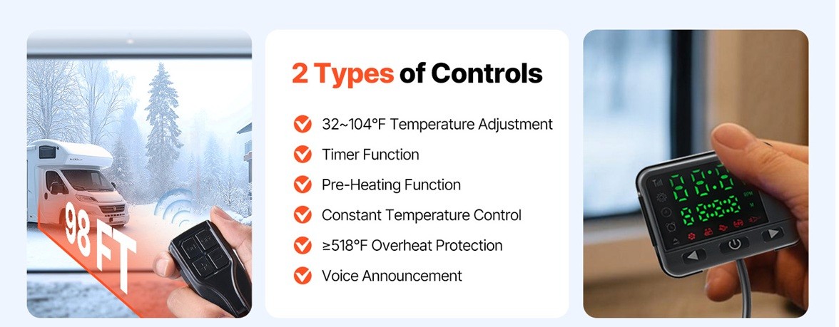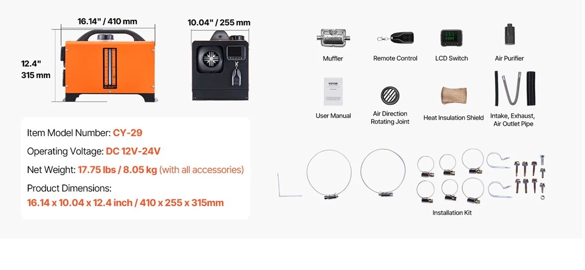 Incalzitor aer diesel Vevor 8 kW (model CY-29) – functionare DC 12V, ideal pentru rulote (RV), camioane, camping, etc. Proiectat pentru incalzire eficienta si consum redus, ofera control digital, telecomanda wireless si anunt vocal pentru operare comoda.